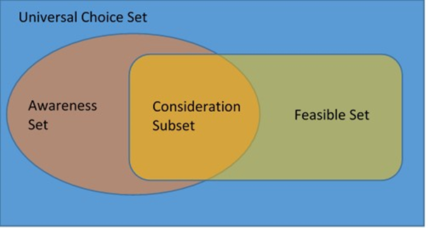 Awareness: As mentioned earlier, the universe of possible destinations can be very large. Individuals are not realistically able to consider and gather complete information on all possible destinations in the region. Given limited information gathering and processing capabilities of humans, and the possibility that individuals search until they are satisfied (satisficing rule), it is likely that individuals are aware of only a subset of alternatives as possible destinations and evaluate (in detail) only those alternatives that comprise the subset. Also, in many choice contexts, individuals may deliberately choose to narrow their search to a subset of alternatives, thus leading to the formation of an awareness set. It should be noted that awareness criteria can be combined with feasibility criteria to form a smaller subset of alternatives that constitute the intersection of these two sets of criteria. This smaller subset would then only include those alternatives that the individual considers feasible and is able to obtain full information to make an informed choice. In the absence of data about alternatives that individuals are aware of, it is difficult to establish robust awareness criteria for inclusion of alternatives in a choice set.