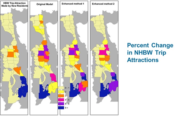 This approach does not require any modification to existing home-based trip component models, and all choices remain easily interpretable. Like the hybrid approach, it can capture agglomeration effects in destination choices, but cannot explicitly represent space-time constraints. It has not been mathematically proven to result in trips consistent with tours with the same rigor as the hybrid approach, but it has been demonstrated to result in more consistent destination (and mode) choices in practical applications. The figure below illustrates how the advanced trip-based approach produces non-home-based-work trip locations consistent with home-based work locations for a new residential development in the far south of the Salt Lake City region in contrast with the traditional four-step model which predicts new non-home-based work trips in the far north of the region even though it predicts no new home-based work trips there.