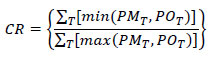 where CR is the Coincidence Ratio; PMT is the proportion of modeled distribution in interval T; POT is the proportion of observed distribution in interval T; and T is the histogram interval for time, distance, or other impedance measure (e.g., 0-4.9 minutes, 5.0-9.9 minutes, etc.)