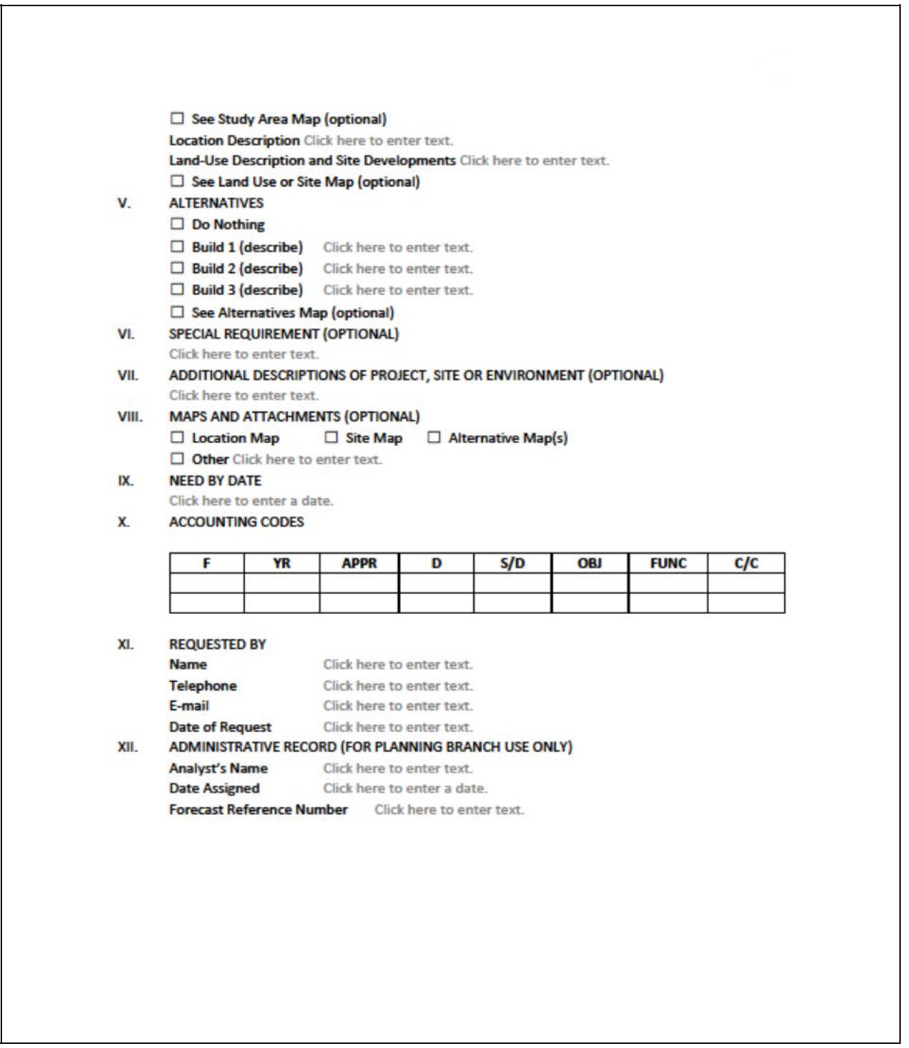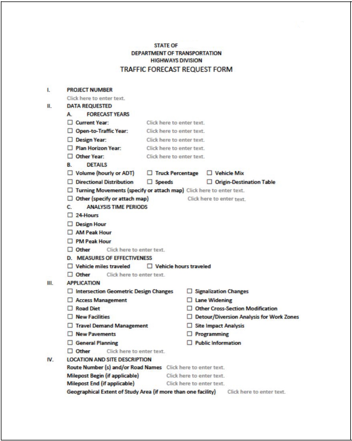 The form shown below may be used for requesting a forecast and is typical. The request must contain the following information (adapted from the “Ohio Certified Traffic Manual” (opens new window) and Hawaii’s “Traffic Assignment Work Order” form):