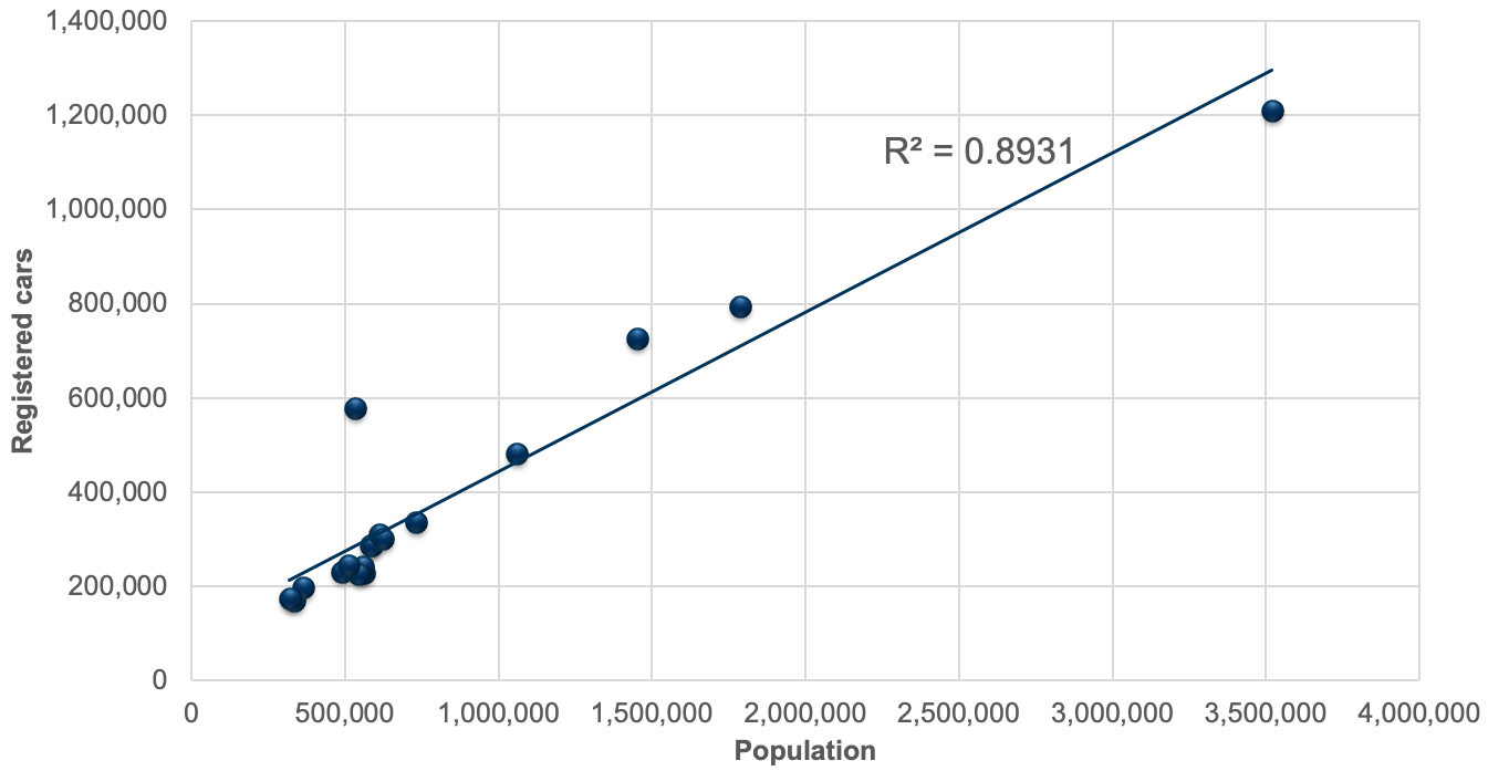 Regression analysis serves to explore the relationship between different variables, such as the number of cars registered in a city and the population of a city. This figure shows that there is -- not surprisingly -- a close relationship between the population in a city and the number of cars registered.