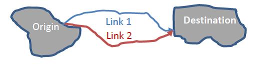 This condition of UE can be described with an example case where an origin destination (OD) pair is connected by two one-way links representing two different routes. Illustrated in Figure 1, the assumed traffic demand between these OD is 3000 vehicle per hour (vph). Fixed characteristics of links utilized in the calculation are listed in Table 1. Travel times on these links are estimated by using a typical Bureau of Public Roads volume delay function shown in equation below where travel time is an increasing function of flow. This type of flow dependent functions for estimating travel time are also called link cost function.